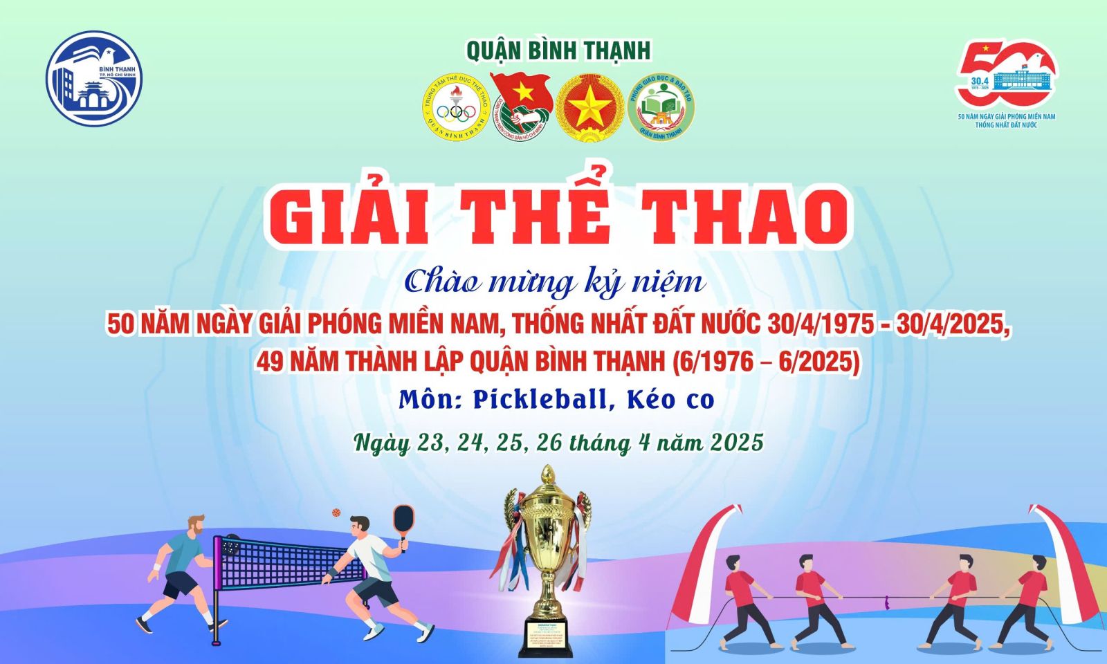 Từ ngày 23 đến 26/4/2025, Trung tâm Thể dục Thể thao, Phòng Giáo dục và Đào tạo, Ban Chỉ huy Quân sự quận, Quận Đoàn phối hợp tổ chức giải thể thao, chào mừng kỷ niệm 50 năm Giải phóng miền Nam, thống nhất đất nước (30/4/1975 - 30/4/2025); 49 năm thành lập quận Bình Thạnh (6/1976 - 6/2025).
