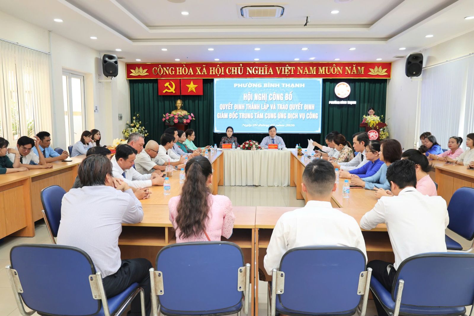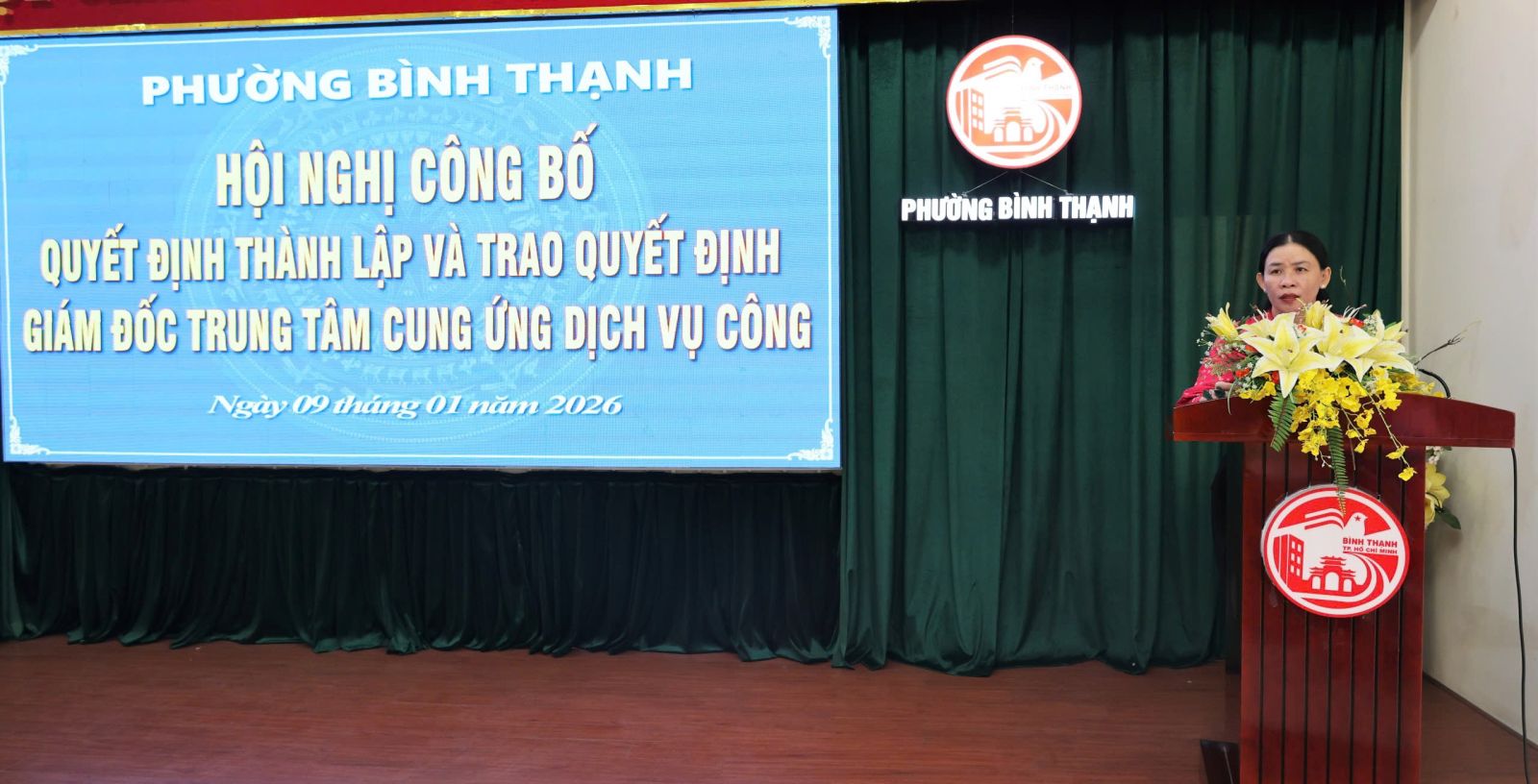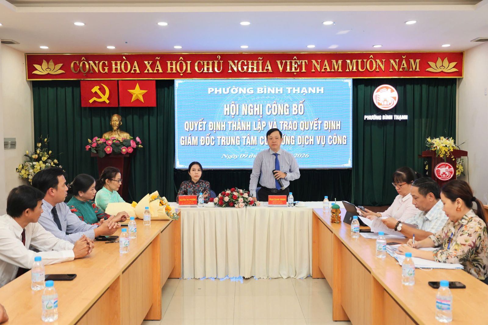 Tại hội nghị, Ủy ban nhân dân phường đã công bố Quyết định thành lập Trung tâm Cung ứng dịch vụ công phường Bình Thạnh trên cơ sở tổ chức lại Trung tâm Cung ứng dịch vụ Văn hóa – Thể thao phường. Trung tâm là đơn vị sự nghiệp công lập trực thuộc Ủy ban nhân dân phường, có chức năng cung cấp các dịch vụ sự nghiệp công cơ bản, thiết yếu trên địa bàn phường Bình Thạnh quản lý theo quy định pháp luật hiện hành gồm: văn hóa, thể thao, du lịch, thông tin, truyền thông, môi trường, đô thị,… và các dịch vụ khác theo hướng dẫn của cấp có thẩm quyền, góp phần nâng cao chất lượng phục vụ Nhân dân và bảo đảm việc thực hiện các nhiệm vụ chuyên môn được thông suốt, hiệu quả. Trung tâm có trụ sở chính tại số 08 Phan Đăng Lưu, phường Bình Thạnh; đồng thời quản lý các cơ sở trực thuộc gồm: Câu lạc bộ Quần vợt (số 02 Nơ Trang Long), Sân vận động Gia Định (số 2A Phan Chu Trinh) và Nhà Truyền thống (số 6B Phan Đăng Lưu), đều thuộc địa bàn phường Bình Thạnh.