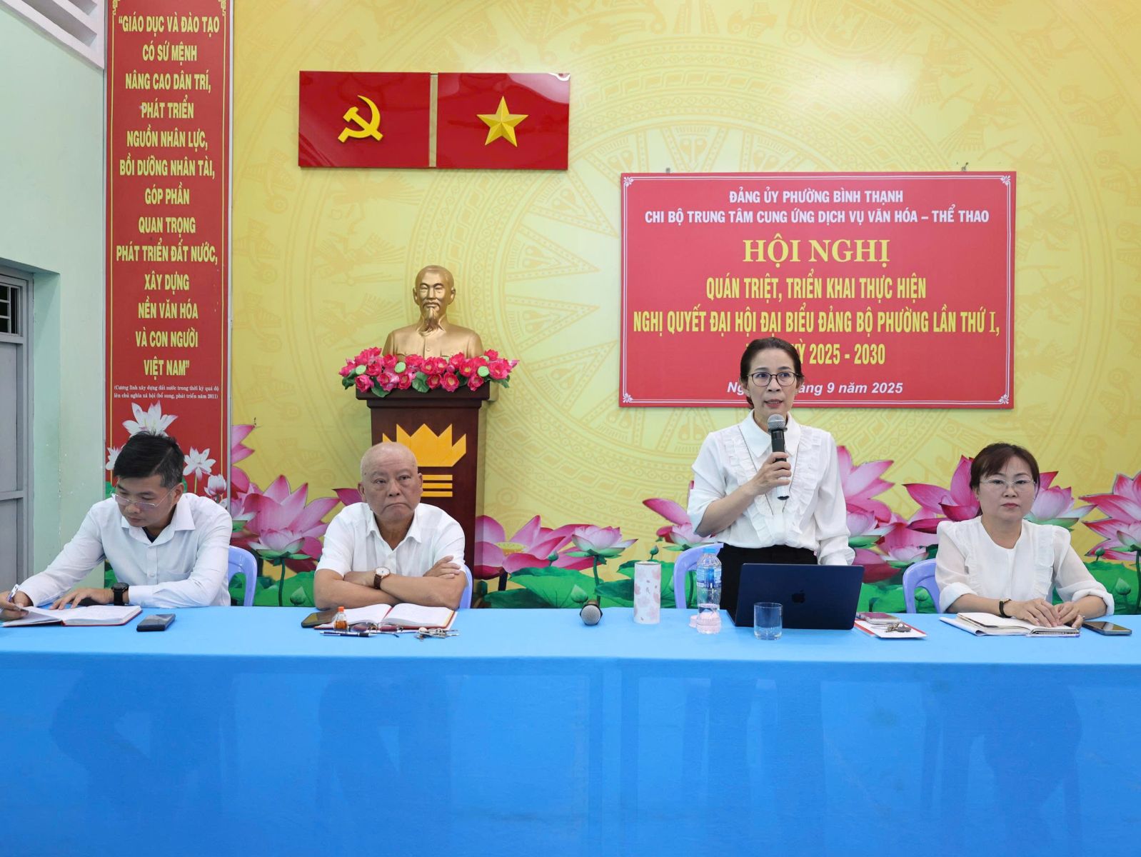 Ngày 29/9/2025, Chi bộ trung tâm Cung ứng dịch vụ văn hóa - thể thao phường Bình Thạnh tổ chức quán triệt, triển khai thực hiện Nghị quyết Đại hội đại biểu Đảng bộ phường Bình Thạnh lần thứ I, nhiệm kỳ 2025 - 2030.