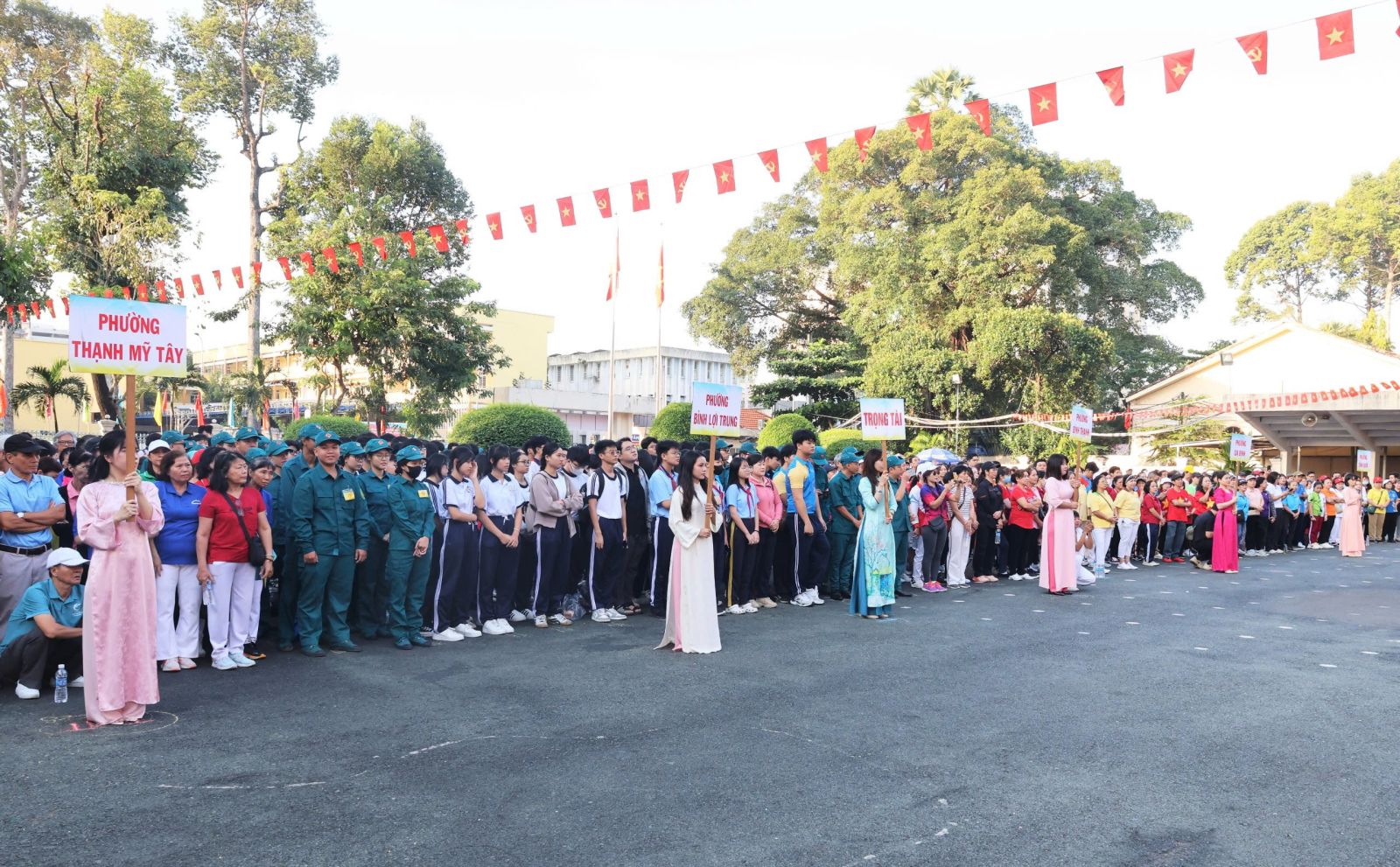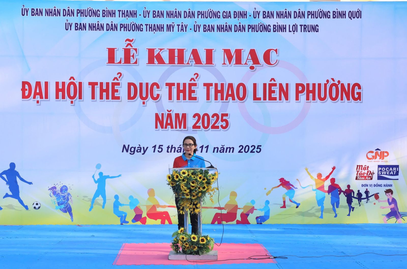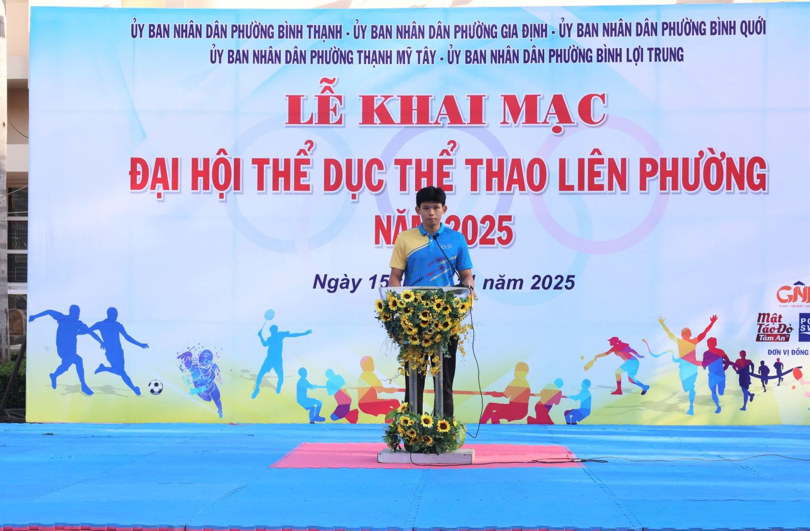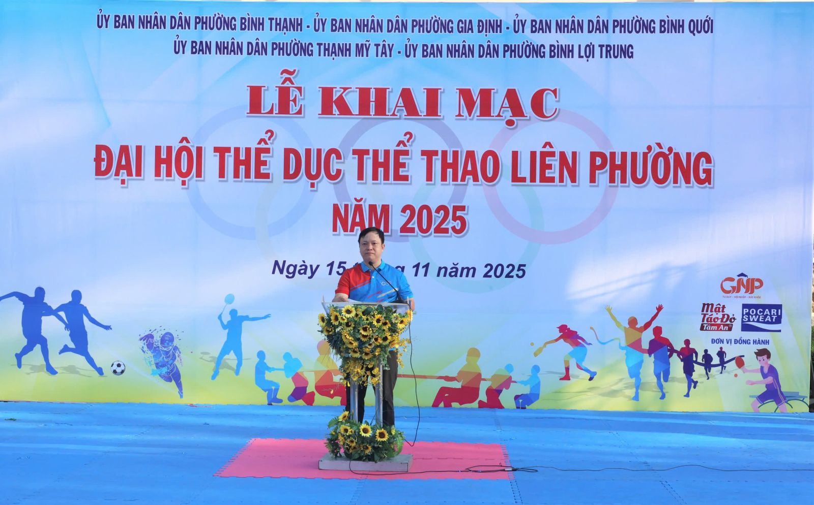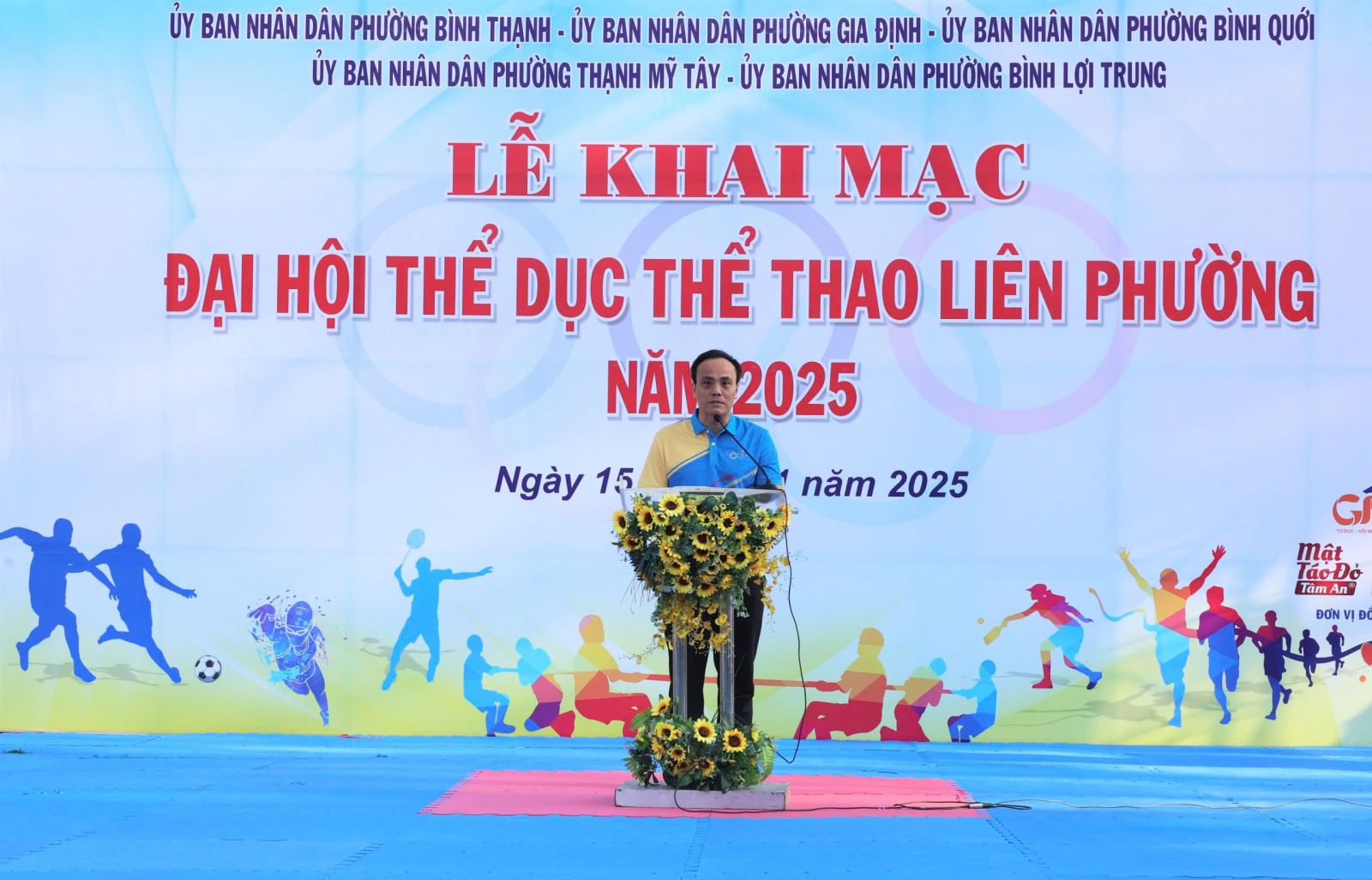 Đại diện lãnh đạo 5 phường phát biểu khai mạc Đại hội, đồng chí Phan Quang Khánh, Phó Bí thư Đảng ủy, Chủ tịch UBND phường Bình Thạnh nhấn mạnh ý nghĩa của phong trào Thể dục thể thao quần chúng trong nâng cao sức khỏe, tăng cường đoàn kết và phát hiện tài năng thể thao. Đồng chí đề nghị Ban Tổ chức điều hành Đại hội bảo đảm an toàn, công bằng, khách quan; lực lượng trọng tài làm nhiệm vụ trung thực, chính xác; vận động viên thi đấu hết mình, đoàn kết, cao thượng, thể hiện tinh thần “Khỏe để xây dựng và bảo vệ Tổ quốc”. Đồng chí ghi nhận sự nỗ lực của các đơn vị phối hợp và tin tưởng Đại hội năm 2025 sẽ đạt được nhiều kết quả tốt đẹp, tạo tiền đề cho thành tích của liên phường tại Đại hội Thể dục Thể thao cấp thành phố sắp tới.