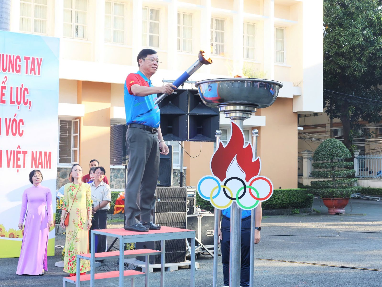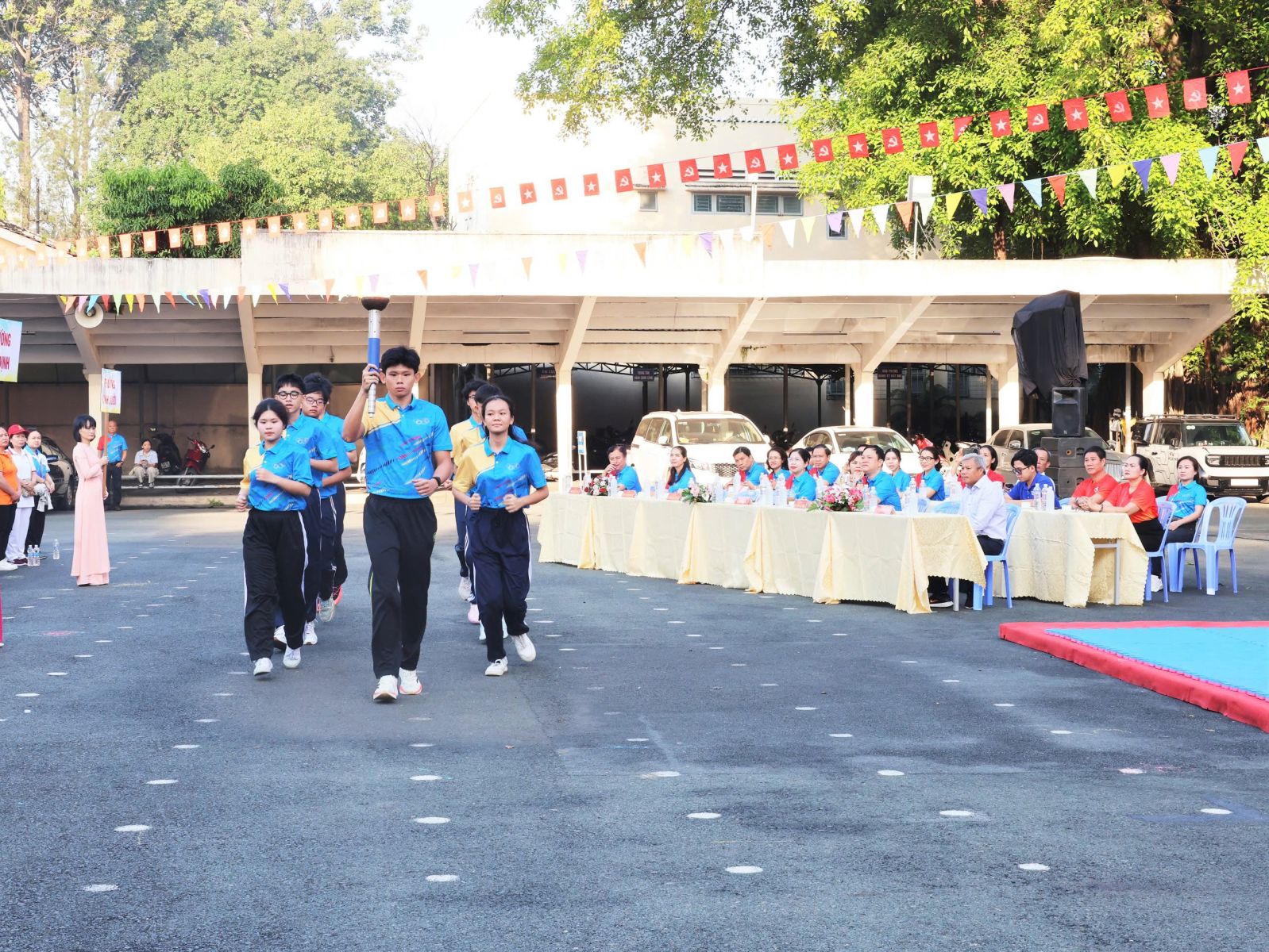 Nghi thức rước đuốc được tổ chức trang trọng khi ngọn đuốc Đại hội được thắp sáng từ Nhà truyền thống phường Bình Thạnh và rước về lễ đài. Vận động viên Đặng Gia Huân, vận động viên Bơi Lặn, Huy chương vàng Giải vô địch Quốc gia 2024 – 2025, dẫn đầu đoàn rước đuốc cùng các vận động viên tiêu biểu. Đồng chí Vũ Ngọc Tuất, Bí thư Đảng ủy, Chủ tịch Hội đồng nhân dân phường Bình Thạnh, thực hiện nghi thức thắp đuốc, chính thức khai mở Đại hội.