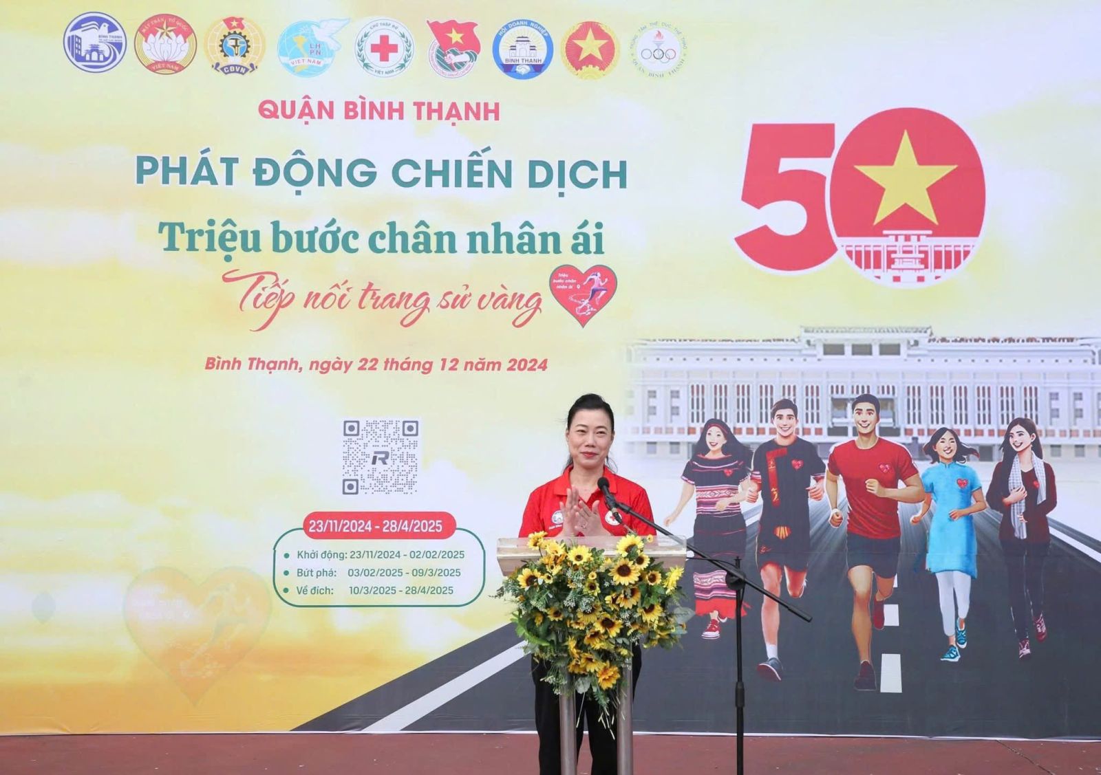 Phát động tại buổi lễ, đồng chí Triệu Lệ Khánh, Phó Bí thư Thường trực Quận ủy, Chủ tịch danh dự Hội Chữ thập đỏ quận kêu gọi các cơ quan, đơn vị, địa phương phát huy tinh thần trách nhiệm, tích cực hưởng ứng, nêu cao tinh thần nhận thức và hành động của mình tham gia, hưởng ứng Chiến dịch “Triệu bước chân nhân ái – Tiếp nối trang sử vàng”. Đồng chí tin tưởng chiến dịch này sẽ đạt được những mục tiêu đề ra, là bước khởi đầu rực rỡ, ấn tượng, tạo động lực, khí thế mạnh mẽ, sôi nổi được triển khai rộng khắp trên địa bàn quận Bình Thạnh nói riêng và Thành phố Hồ Chí Minh nói chung.