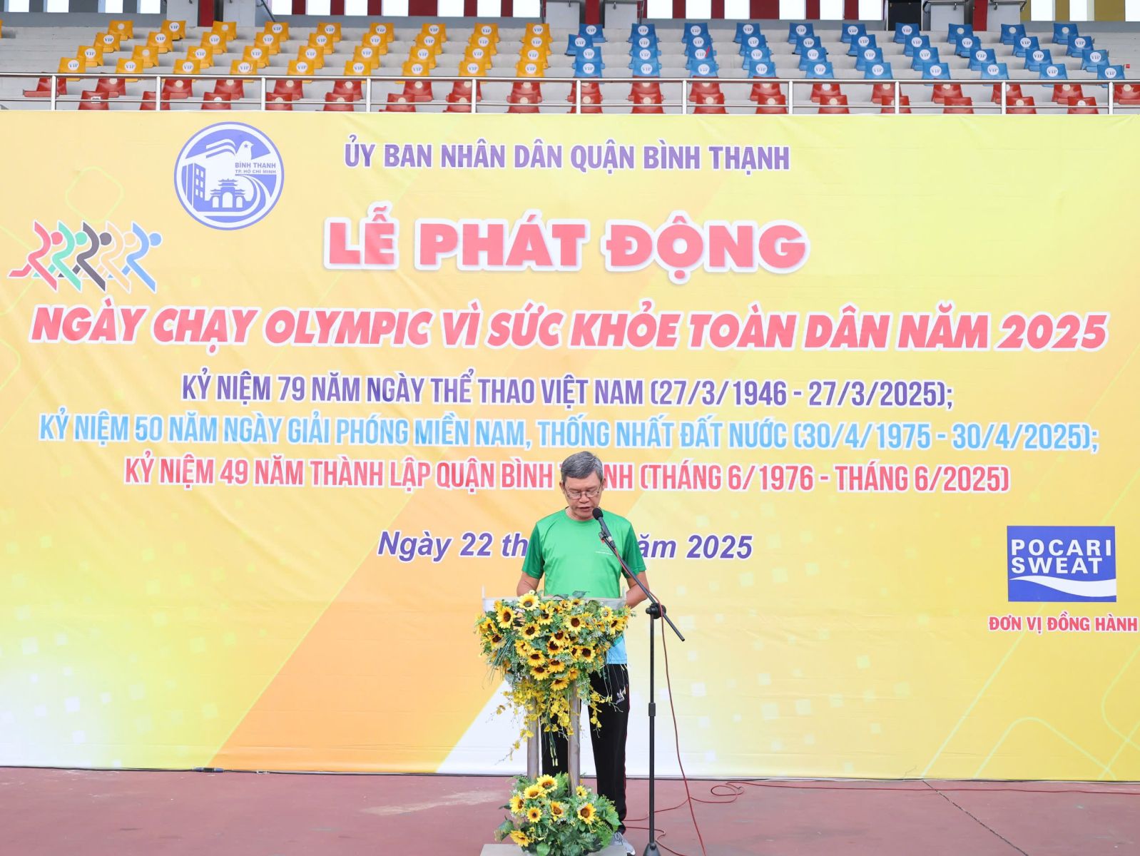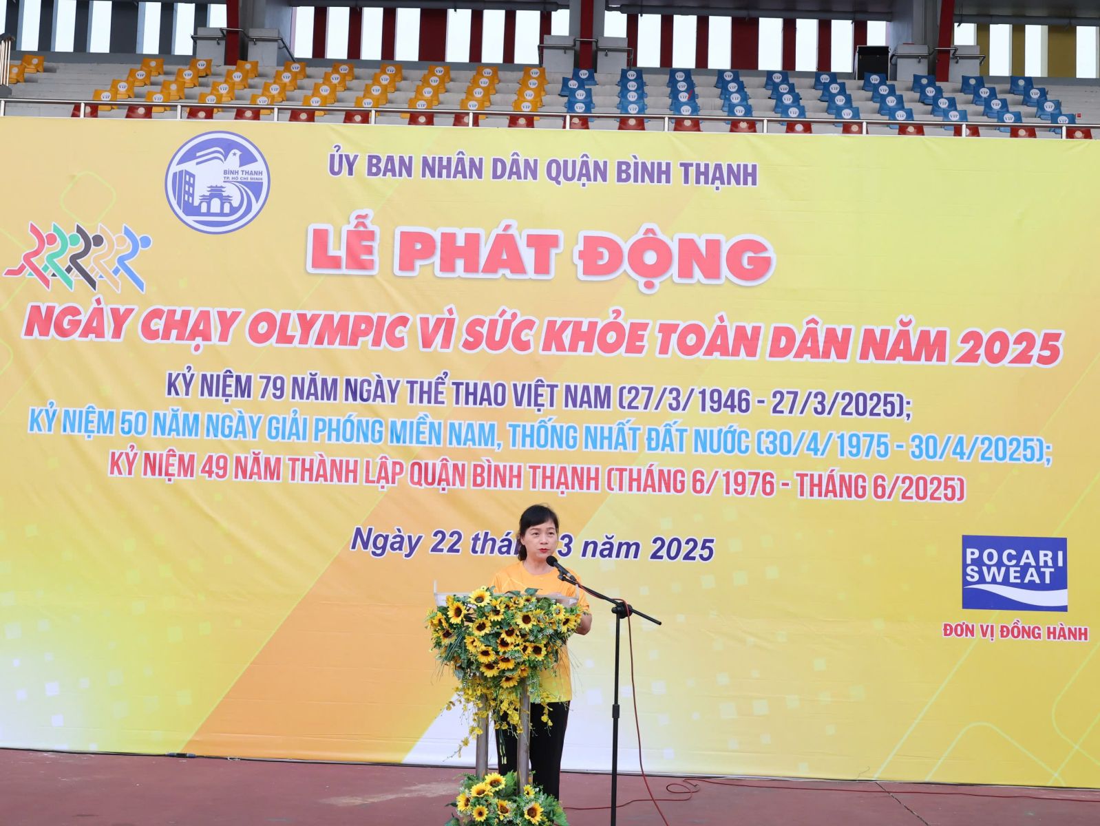 Phát biểu khai mạc lễ phát động Ngày chạy Olympic vì sức khỏe toàn dân, đồng chí Phó Chủ tịch quận Thái Thị Hồng Nga nhấn mạnh: Thực hiện “Lời kêu gọi toàn dân tập thể dục” và tư tưởng của Chủ tịch Hồ Chí Minh về xây dựng nền thể thao nước nhà, quận Bình Thạnh tổ chức “Ngày chạy Olympic vì sức khỏe toàn dân năm 2025 nhằm tiếp tục tuyên truyền, vận động Nhân dân nâng cao hơn nữa nhận thức về ý nghĩa và tác dụng của việc tập luyện thể dục thể thao, đẩy mạnh thực hiện cuộc vận động “Toàn dân rèn luyện thân thể theo gương Bác Hồ vĩ đại”, xây dựng thói quen tập luyện thể dục, nâng cao sức khỏe và chất lượng cuộc sống của Nhân dân góp phần vào sự nghiệp xây dựng và bảo vệ Tổ quốc Việt Nam xã hội chủ nghĩa.